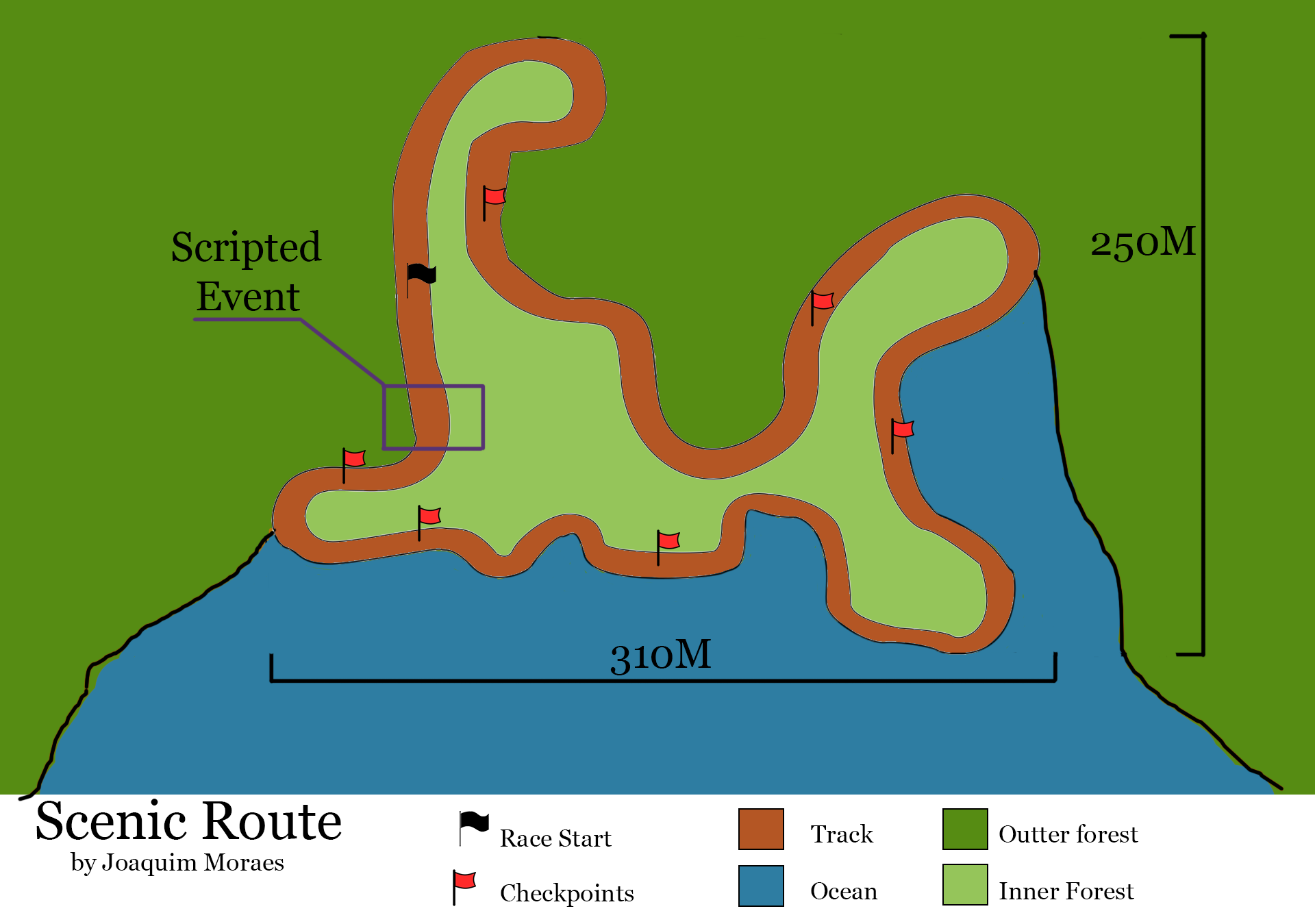 I decided to go for a more realistic approach when designing the track. To achieve that, I looked at many references of roads and racing circuits. My primary reference for the setting were segments of the Pacific Coast Highway or California's State Route 1. I used that road as a setting for a few reasons, first I wanted to have dangerous exciting parts with high intensity in my level, so I incorporated a cliff side part with some hard turns to make them fell more dangerous, I also observed that the Pacific Coast Highway had a lot of flora in the side opposite to the ocean, so I used that side to give the player some less intense parts, for them to breathe.